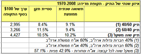 במהלך התקופה שבין 1970-2008 הניבו קבוצות נכסים אלו תשואות שנתיות ממוצעות שנעו בין 6.2% (T-BILLS) ל- 10.6% (נדל"ן). מסתבר שלמרות המשבר, בפרספקטיבה של 39 שנים, הנדל"ן היה אפיק ההשקעה בעל התשואה הגבוהה ביותר. שנת 2008 הייתה אמנם אחת השנים הקשות בהיסטוריה של שווקי המניות, אולם על פני 30 שנים הניבו מדדי המניות תשואות שנתיות נדיבות שנעו בין 9% (חברות בינלאומיות ללא ארה"ב) ל- 10.3% (חברות קטנות בארה"ב). באופן קצת מפתיע הניבו האג"ח הממשלתי והסחורות תשואות גבוהות יחסית של 8.1% ו- 9.9% בהתאמה.